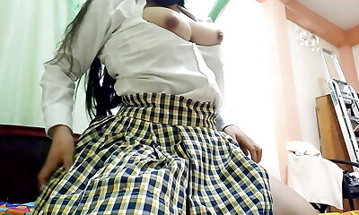 Asian teen in schoolgirl uniform stripped